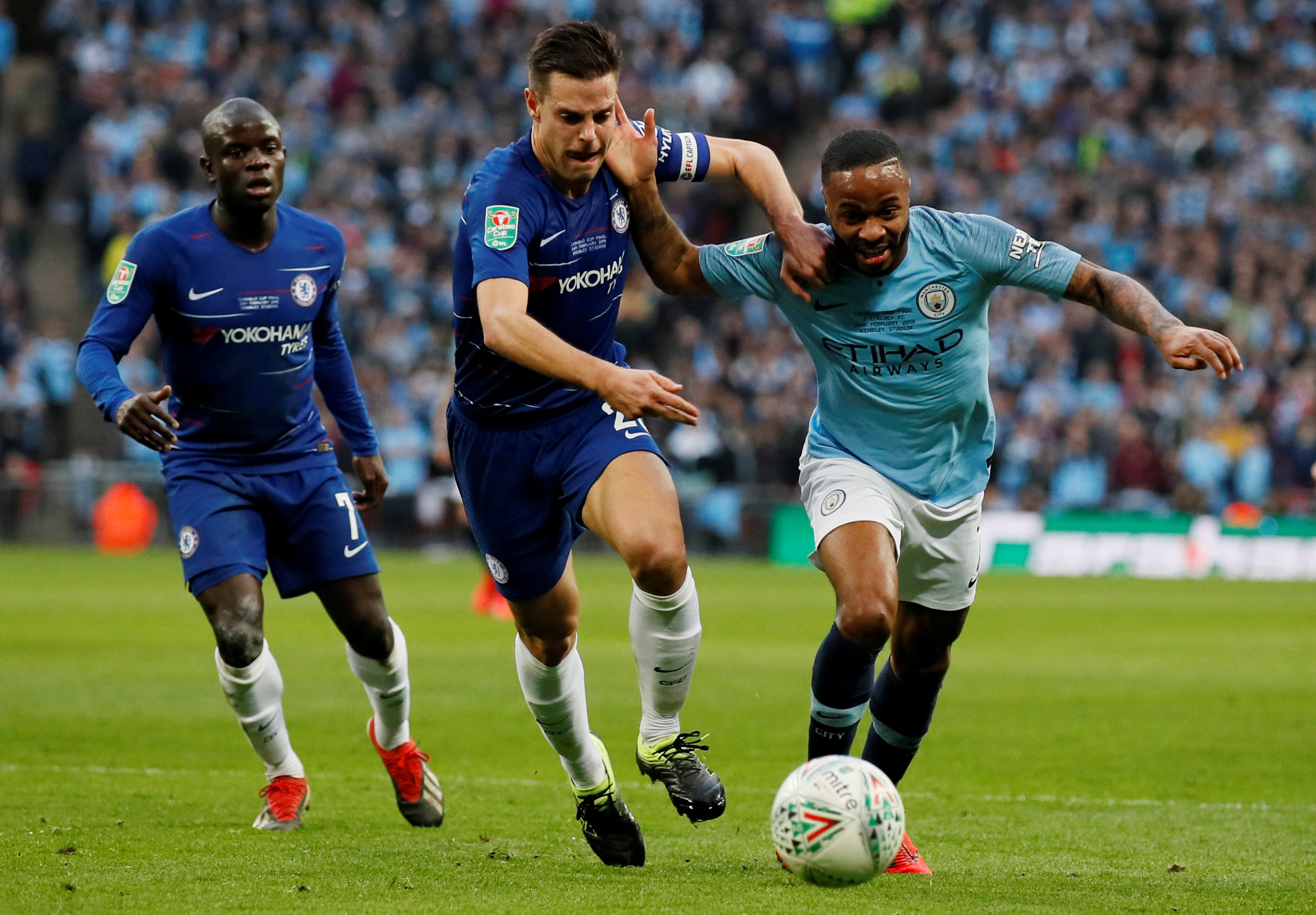 Soccer Football – Carabao Cup Final – Manchester City v Chelsea – Wembley Stadium, London, Britain – February 24, 2019 Manchester City’s Raheem Sterling in action with Chelsea’s Cesar Azpilicueta REUTERS/David Klein EDITORIAL USE ONLY. No use with unauthorized audio, video, data, fixture lists, club/league logos or “live” services. Online in-match use limited to 75 images, no video emulation. No use in betting, games or single club/league/player publications. Please contact your account representative for further details.