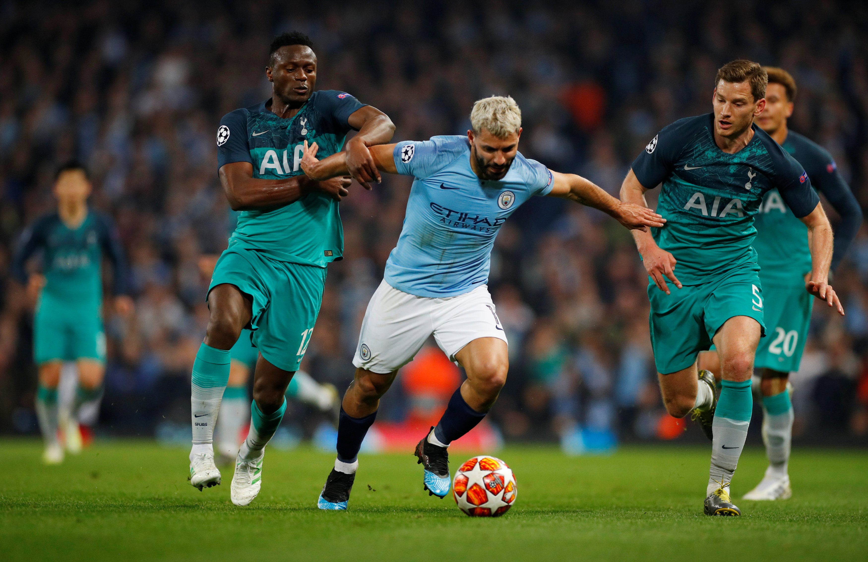 Soccer Football – Champions League Quarter Final Second Leg – Manchester City v Tottenham Hotspur – Etihad Stadium, Manchester, Britain – April 17, 2019 Manchester City’s Sergio Aguero in action with Tottenham’s Victor Wanyama and Jan Vertonghen REUTERS/Phil Noble