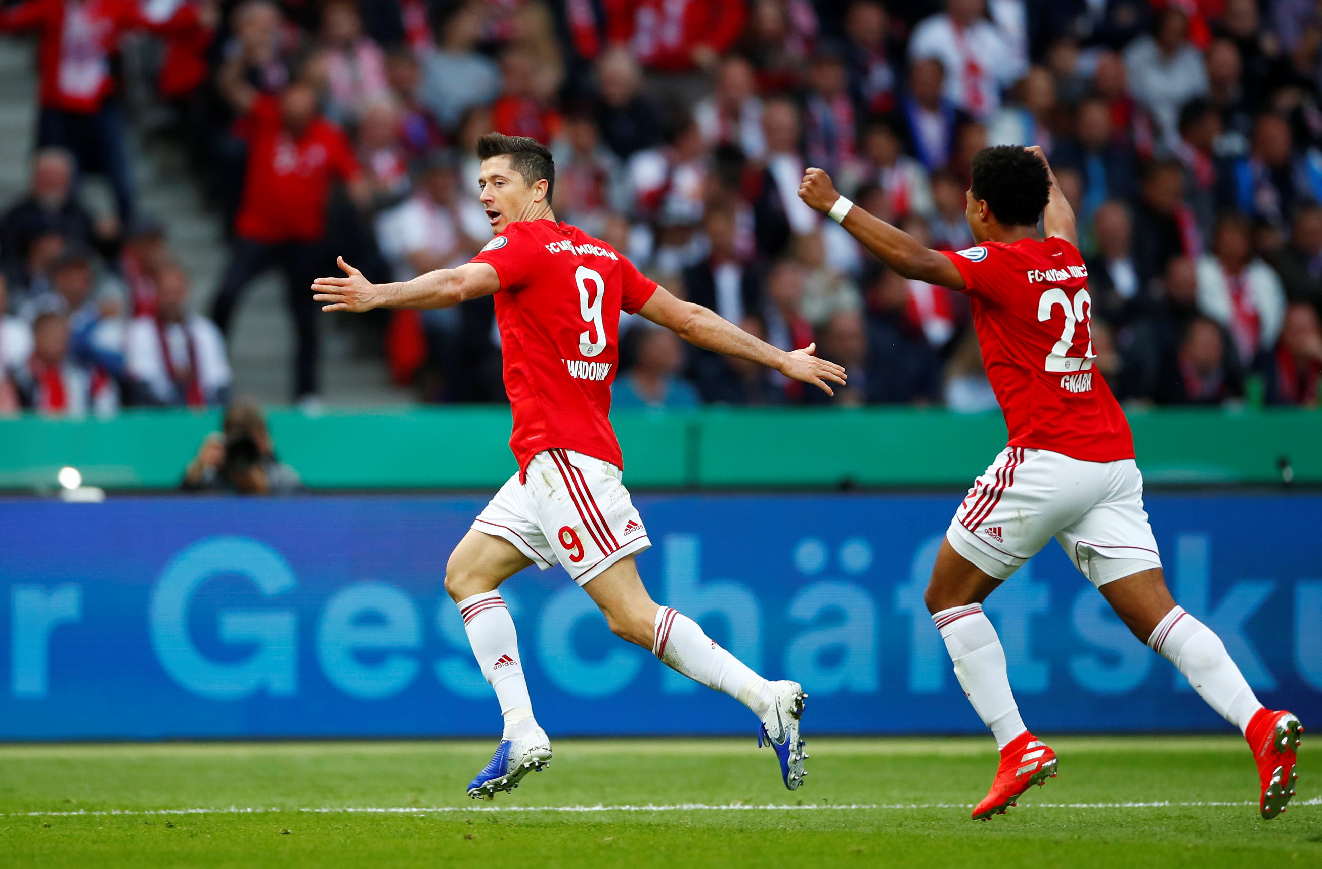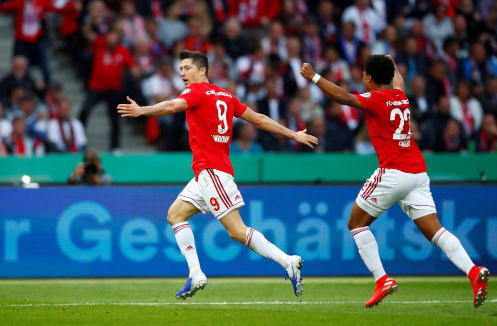 Soccer Football – DFB Cup – Final – RB Leipzig v Bayern Munich – Olympiastadion, Berlin, Germany – May 25, 2019 Bayern Munich’s Robert Lewandowski celebrates with Serge Gnabry after scoring their first goal REUTERS/Wolfgang Rattay DFB regulations prohibit any use of photographs as image sequences and/or quasi-video