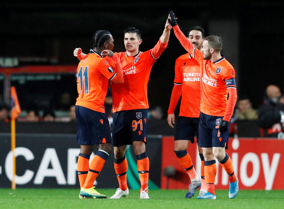 Soccer Football – Europa League – Round of 32 Second Leg – Istanbul Basaksehir v Sporting CP – Basaksehir Fatih Terim Stadium, Istanbul, Turkey – February 27, 2020 Istanbul Basaksehir’s Danijel Aleksic celebrates scoring their second goal with teammates REUTERS/Murad Sezer