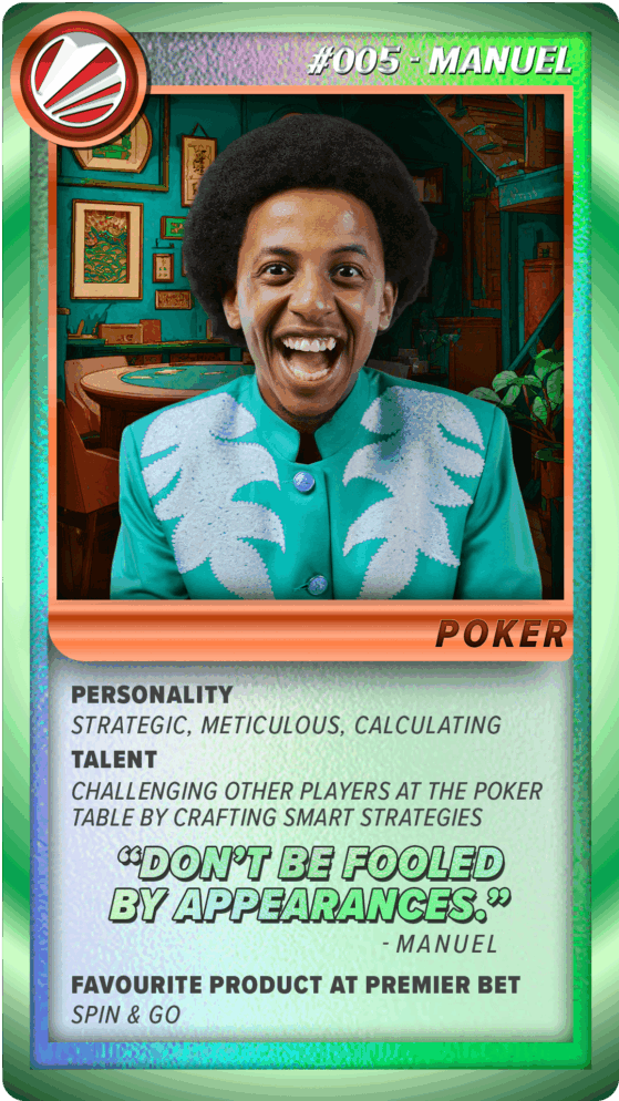 As part of our new campaign, step into the house of Guinée Games! Each week, we shine a spotlight on one of our iconic characters, inspired by the thrill of poker and the excitement of the game. Today, meet Manuel, the mastermind of the perfect hand.