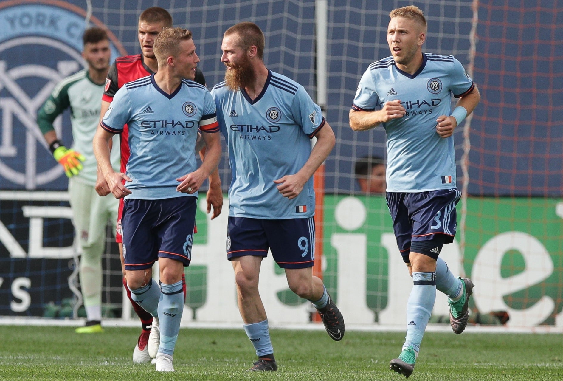 Jun 24, 2018; New York, NY, USA; New York City forward Jo Inge Berget (9) celebrates his goal with midfielder Alexander Ring (8) and defender Anton Tinnerholm (3) during the second half against Toronto FC at Yankee Stadium. Mandatory Credit: Vincent Carchietta-USA TODAY Sports