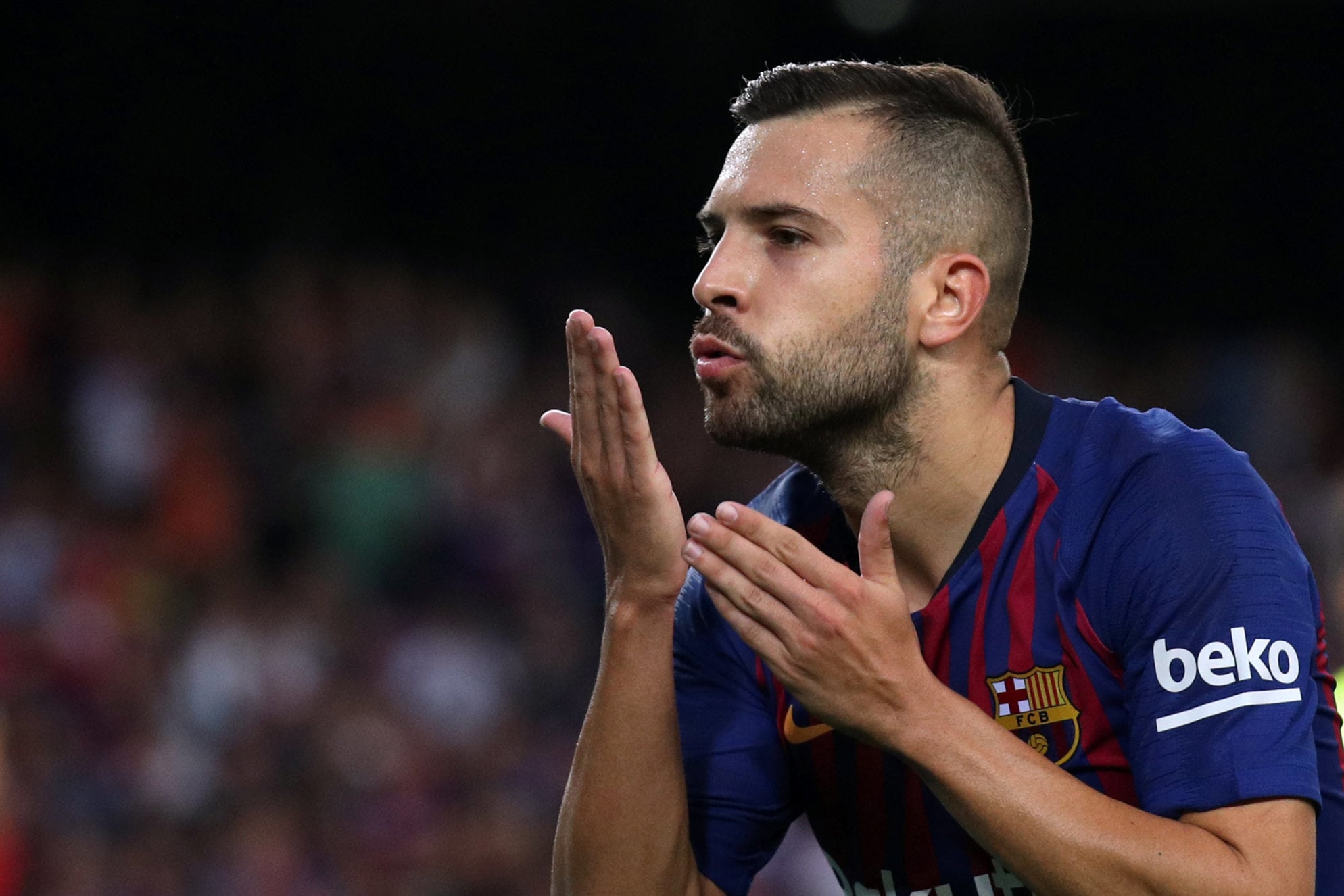 La Liga Santander – FC Barcelona v SD Huesca Soccer Football – La Liga Santander – FC Barcelona v SD Huesca – Camp Nou, Barcelona, Spain – September 2, 2018 Barcelona’s Jordi Alba celebrates scoring their seventh goal REUTERS/Albert Gea