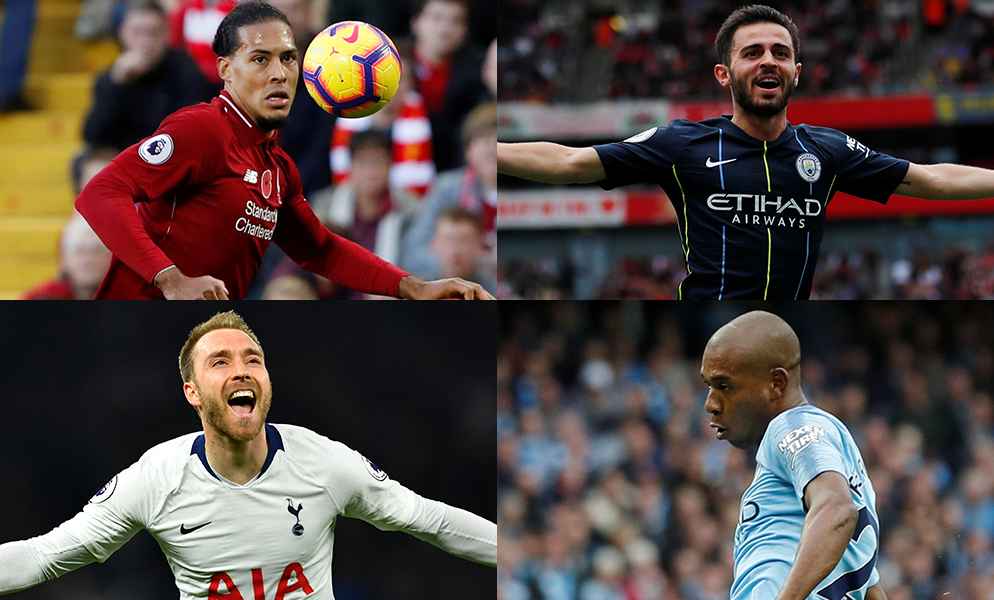 Ederson (Man City), Wan-Bissaka (Crystal Palace), Van Dijk (Liverpool), Laporte (Man City), Robertson (Liverpool), Fernandinho (Man City), B. Silva (Man City), Eriksen (Tottenham), Sterling (Man City), Aguero (Man City), Mane (Liverpool)