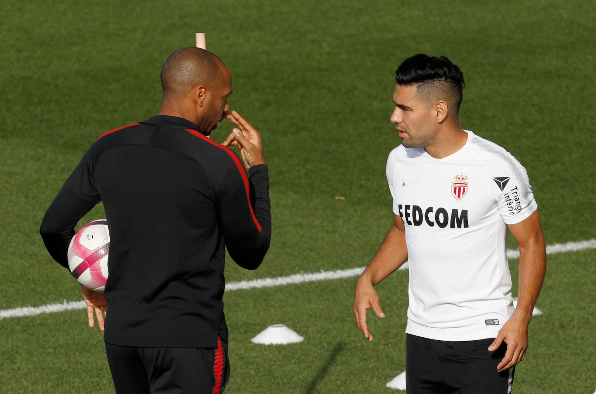 AS Monaco Training Soccer Football – Ligue 1 – AS Monaco Training – La Turbie Training Centre, France – October 18, 2018 AS Monaco coach Thierry Henry with Radamel Falcao during training REUTERS/Eric Gaillard