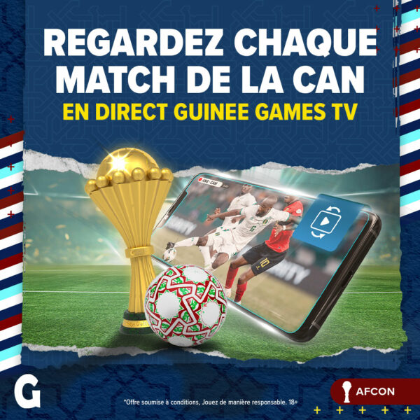Avec Guinée Games TV, vous pouvez regarder tous les matchs de la CAN en direct. Il vous suffit de vous connecter à votre compte Guinée Games, d’aller dans le menu « En direct » et de trouver l’icône Guinée Games TV. Il ne vous reste ensuite plus qu’à profiter des matchs de la CAN et à encourager votre pays avec nous.